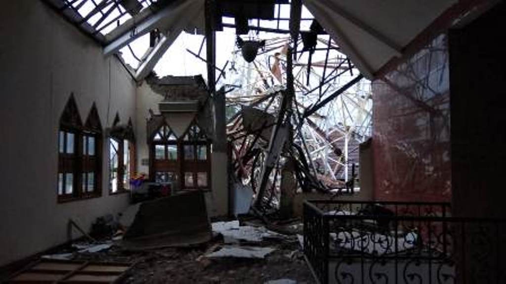 Pantauan Medcom.id, sebagian atap dan ruangan di lantai masjid hancur. Serpihan reruntuhan mengotori lantai dua masjid.