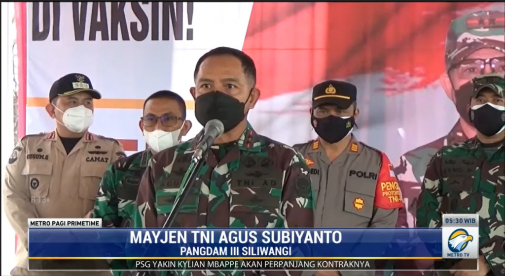“Kami menargetkan 35 ribu vaksin per hari, namun sesuai persediaan vaksin di Dinas Kesehatan,” ujar Pangdam III Siliwangi Mayjen TNI Agus Subiyanto dalam program Metro Pagi Primetimedi Metro TV, Kamis, 16 September 2021.