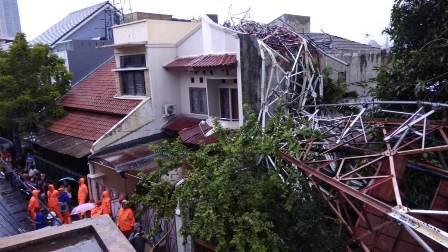 Jakarta: Menara Base Transceiver Station (BTS) atau pemancar Radio Republik Indonesia (RRI) di Jalan Antena 7, Radio Dalam, Kebayoran Baru, Jakarta Selatan, ambruk menimpa lima bangunan. Salah satunya tempat ibadah.