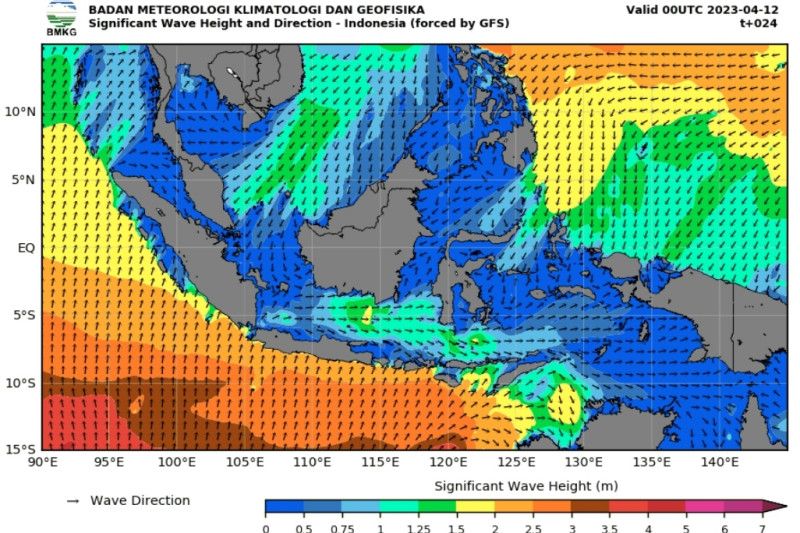 BMKG) melaporkan gelombang tinggi hingga empat meter berpotensi terjadi di sejumlah wilayah perairan Indonesia pada 13-14 April 2023. Pola angin disebut menjadi salah satu faktor yang menyebabkan terjadinya peluang peningkatan gelombang tinggi.