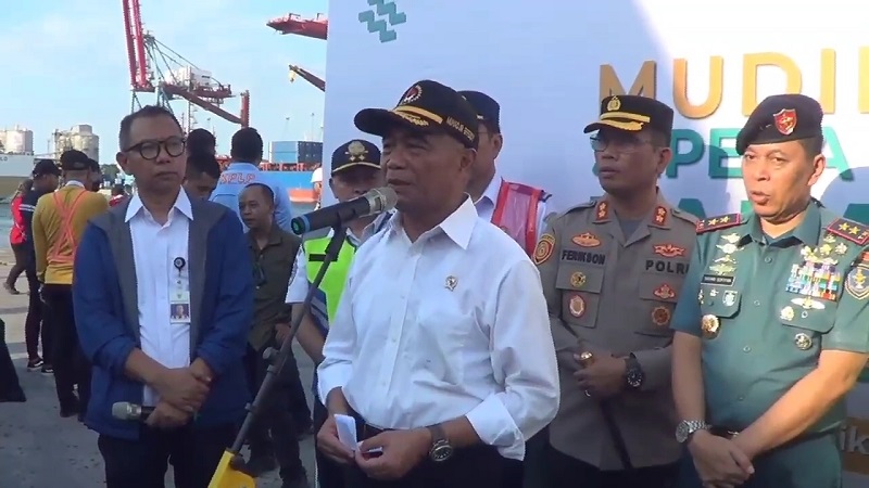 Jakarta: Menteri Koordinator Pembangunan Manusia dan Kebudayaan (Menko PMK) Muhadjir Effendy bersama Menteri Perhubungan (Menhub) Budi Karya Sumadi melepas keberangkatan mudik gratis motor menggunakan kapal. Dalam kesempatan ini, Muhadjir menyarankan agar tahun depan ada penambahan kapasitas.