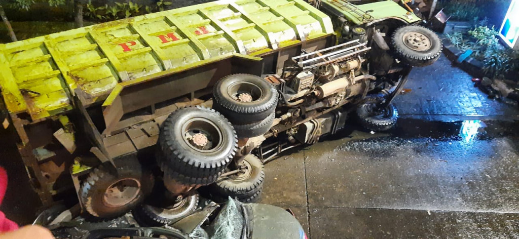 terjun bebas dari atas flyover Slipi Jalan Gatot Subroto, Tanah Abang, Jakarta Pusat pada Sabtu, 27 Maret 2021. Truk jatuh menimpa mobil dinas milik TNI hingga tidak berbentuk.