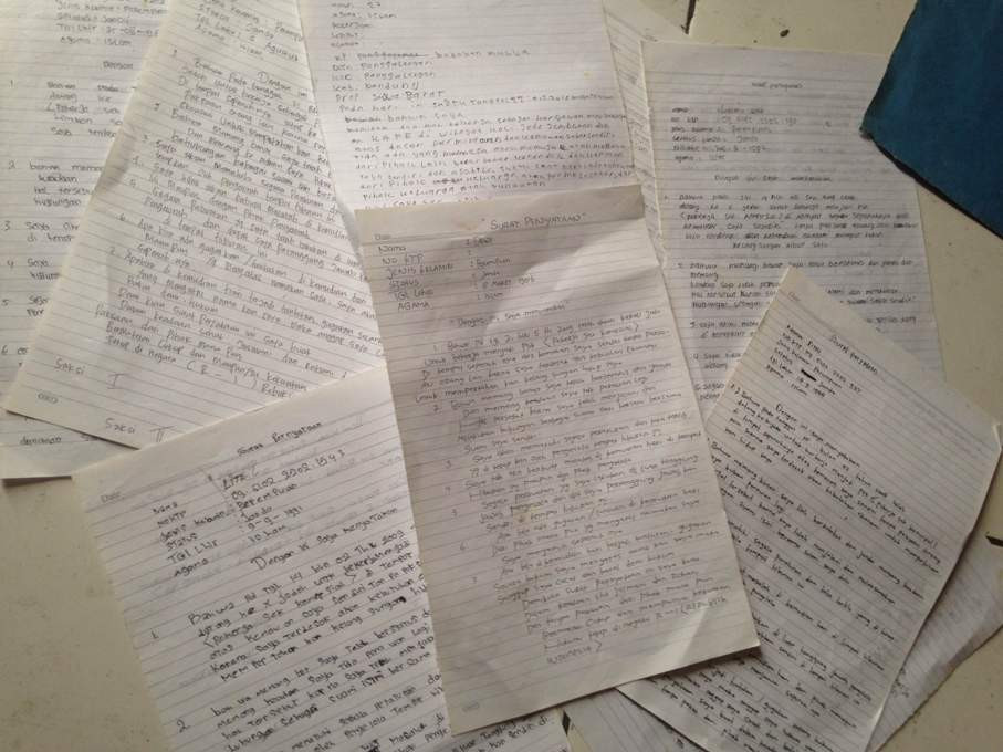 Surat pernyataan tersebut tertuang dalam lembaran kertas yang terlihat berserakan di atas lantai salah satu kafe di kawasan Kalijodo. Di atas lantai itu, terlihat12 surat pernyataan yang ditulis tangan langsung yang dibuat oleh para kupu-kupu malam di Kalijodo.