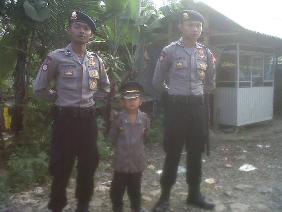 Uniknya, salah satu dari tiga orang berperawakan gagah itu adalah polisi cilik. Namanya Raihan Riani. Dia menggunakan baju polisi dilengkapi bintang tiga di pundaknya. Dia juga mengenakan topi ala polisi. Raihan adalah anak salah satu warga setempat.