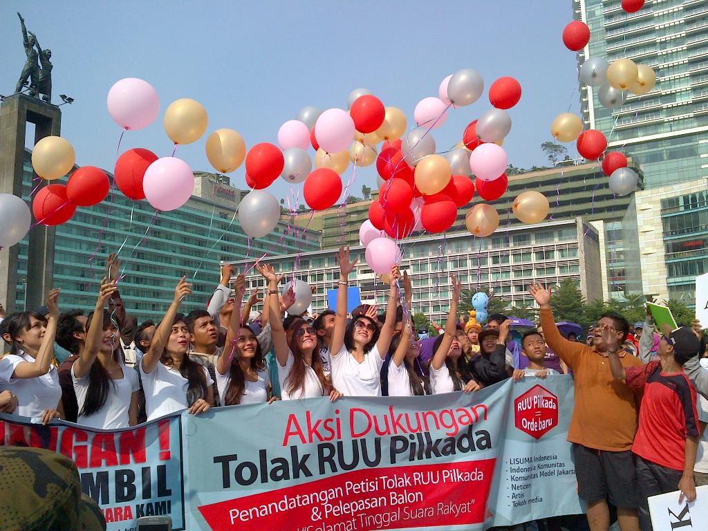 Sekitar 200 orang anggota Lisuma membentangkan spanduk berisi penolakan terhadap sistem pilkada tertutup yang tertuang dalam draf RUU Pilkada, yang rencananya akan ditetapkan melalui Sidang Paripurna DPR, 25 September.
