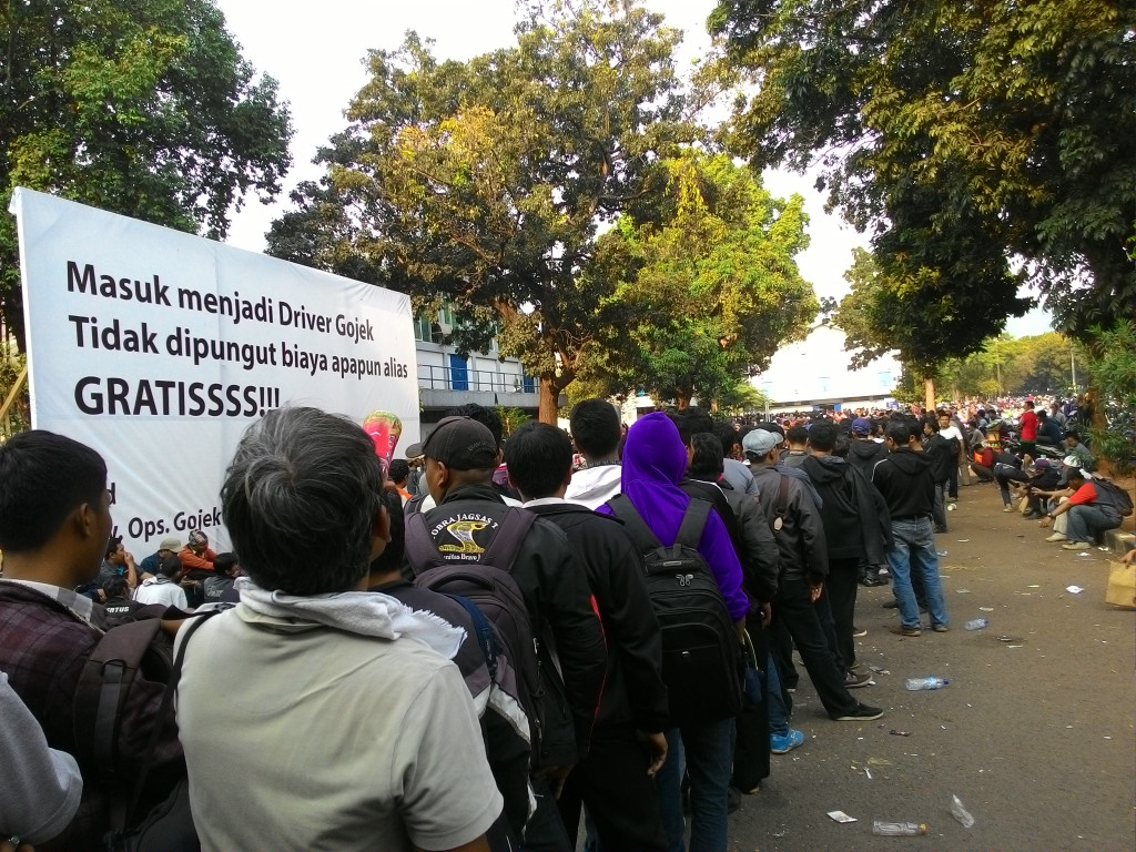 Di tengah antrean dia baru sadar, ternyata antrean tersebut untuk melamar Go-Jek. "Saya pikir tadi tempat registrasi tiket konser," ujarnya.