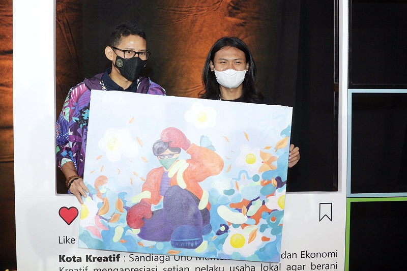 Jakarta: Menteri Pariwisata dan Ekonomi Kreatif (Menparekraf) Sandiaga Uno menghadiri workshop program Kabupaten-Kota (KaTa) Kreatif. Salah satu peserta, Anindhita Kirana Isa, 23, menantang Sandiaga menggambar.