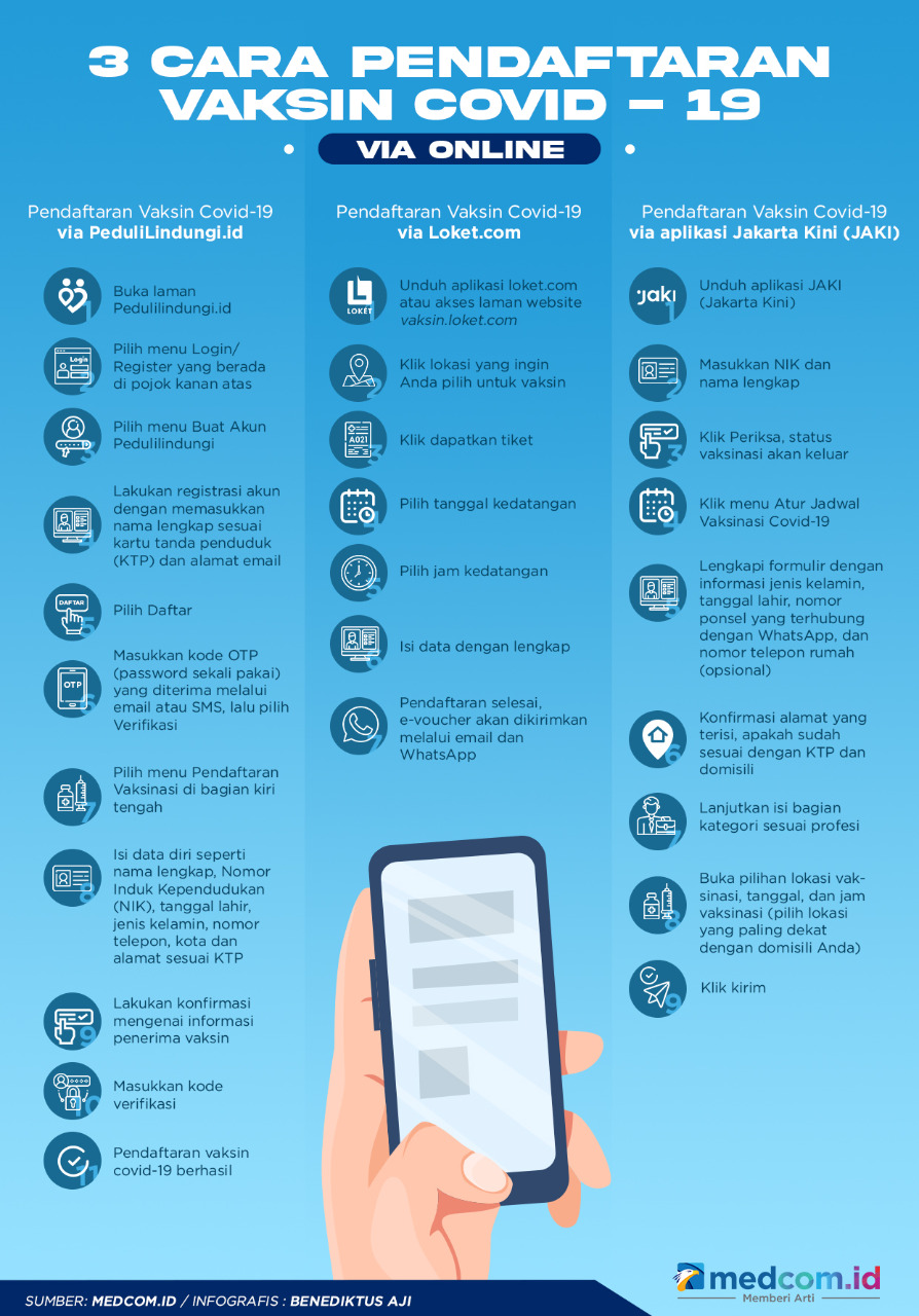 Jakarta: Pendaftaran vaksinasi covid-19 untuk masyarakat umum masih dibuka secara serentak di seluruh Indonesia. Masyarakat dapat mendaftarkan diri secara daring melalui tiga aplikasi resmi.