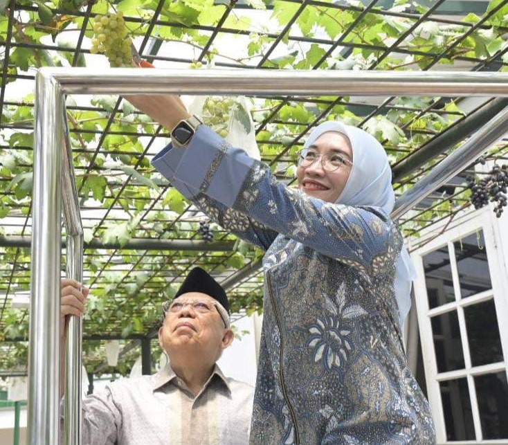 Dalam suasana riang, Wapres beserta anak dan cucunya secara bergantian memetik buah anggur hijau dan merah yang cantik bergelantungan. Begitu juga dengan Wury Ma'ruf Amin yang sampai harus menaiki tangga untuk memilih anggur yang benar-benar matang dan siap dimakan.