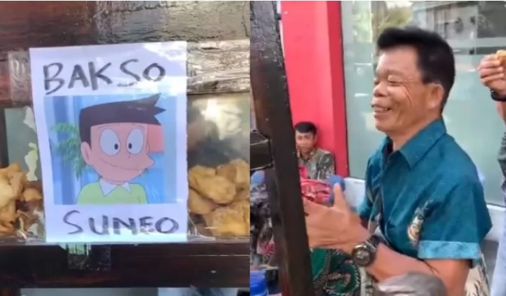 Dari video yang beredar di media sosial, penjual bakso tersebut juga memasang gambar Suneo di gerobak bakso miliknya dengan tulisan 'Bakso Suneo'.