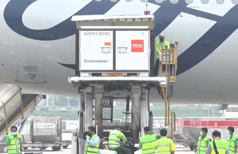 Sebanyak 10 juta dosis bulk (bahan baku) vaksin produksi Sinovac tiba di Indonesia menggunakan pesawat Garuda Indonesia. Istimewa