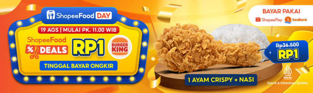 ShopeeFood Day pada 19 Agustus 2025, ShopeeFood kembali menghadirkan penawaran eksklusif Rp1 untuk pembelian paket makanan di Burger King. Menu 1 Ayam Crispy + Nasi Rp1, bisa dipesan langsung lewat fitur ShopeeFood Deals di aplikasi Shopee dengan pembayaran via ShopeePay dan SeaBank Bayar Instan. Ini menjadi sebuah kesempatan istimewa untuk menikmati menu andalan dengan harga super hemat.