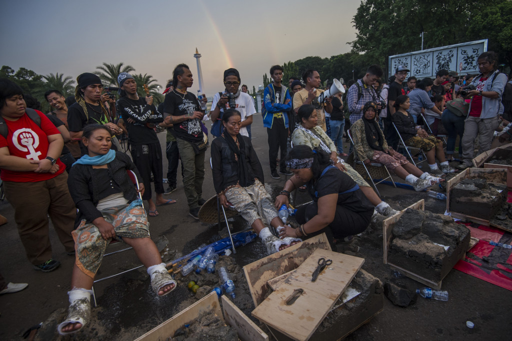 Sembilan petani wanita menyemen kakinya di depan Istana guna menuntut penutupan pabrik semen di Pegunungan Karst, Kendeng, Jawa Tengah. Menurut mereka, petani khawatir berdirinya pabrik semen akan menghilangkan mata pencarian penduduk setempat.
