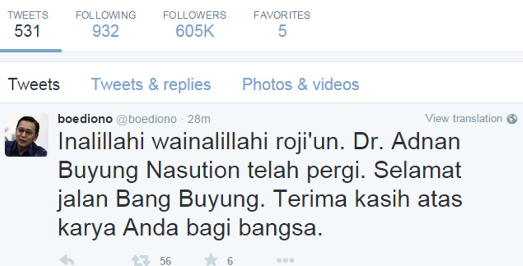 "Inalillahi wainalillahi rojiun. Dr. Adnan Buyung Nasution telah pergi. Selamat jalan Bang Buyung. Terima kasih atas karya Anda bagi bangsa," tulis Boediono dalam akun Twitter resminya, @boediono beberapa menit lalu, Rabu (23/9/2015).