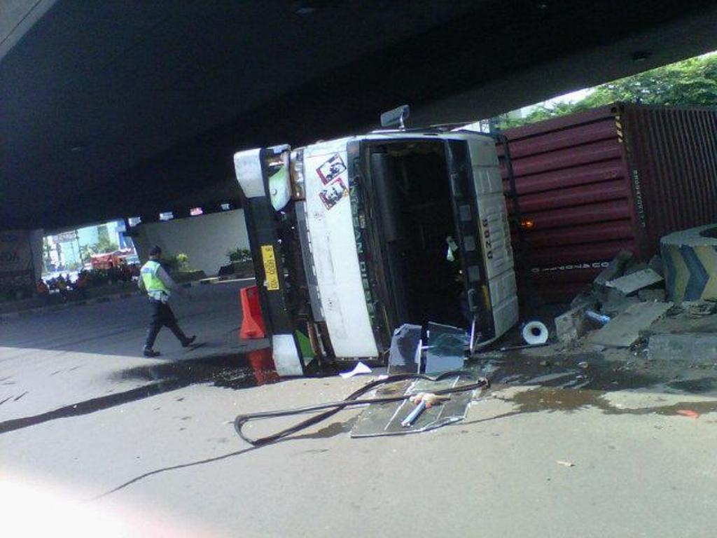 medcom.id, Jakarta: Sebuah truk kontainer B 9605 OD terguling di Perempatan Tomang Jalan S Parman, Jakarta Barat (Jakbar). Truk tersebut terguling di bawah kolong fly over.