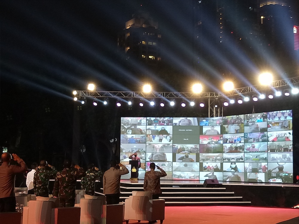 Jakarta: Kapolri Jenderal Listyo Sigit Prabowo memimpin penghormatan untuk para pejuang covid-19. Penghormatan diberikan pada malam apresiasi relawan Vaksinasi Merdeka, bertepatan peringatan Hari Ulang Tahun (HUT) ke-76 RI, Selasa, 17 Agustus 2021.