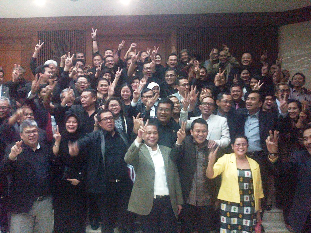 Sesaat setelah meninggalkan ruang sidang, anggota fraksi tiga partai koalisi ini sempat mengabadikan foto, dan bernyanyi salam dua jari di depan ruang sidang paripurna.