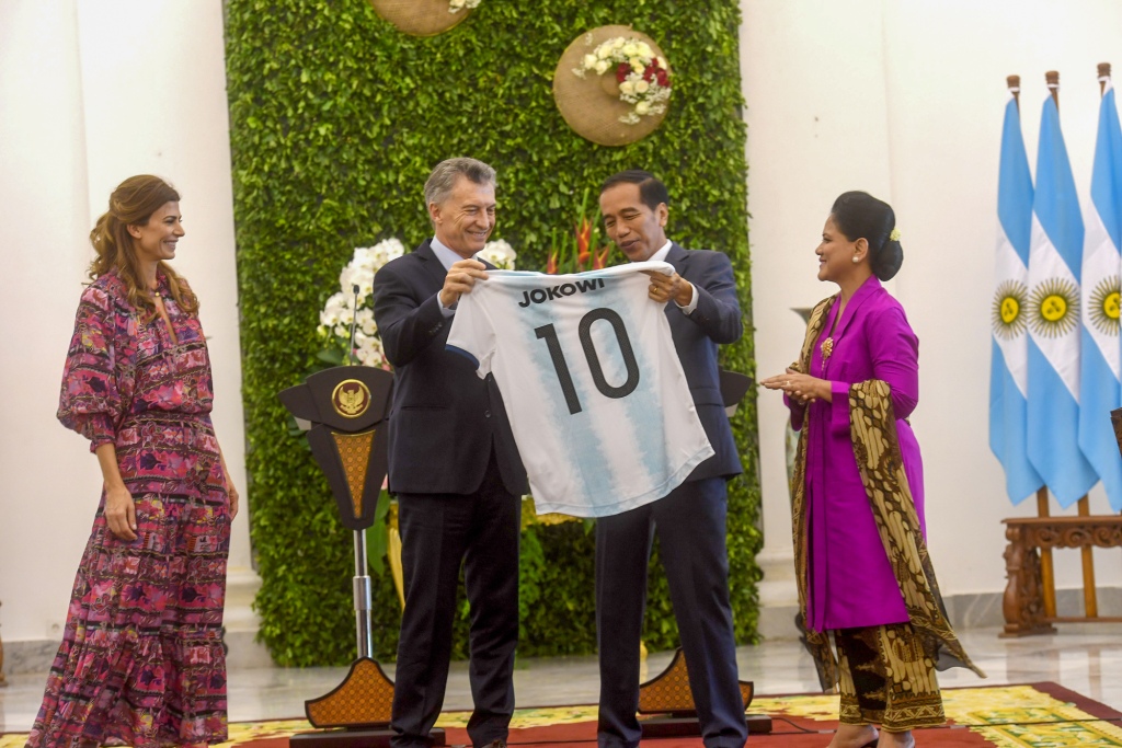 Presiden Macri terlebih dulu memamerkan cendera mata yang dibawa dari 'Negeri Tango' itu. Ia memperlihatkan seragam tim nasional Argentina bernomor punggung 10 dan bertuliskan nama Jokowi.