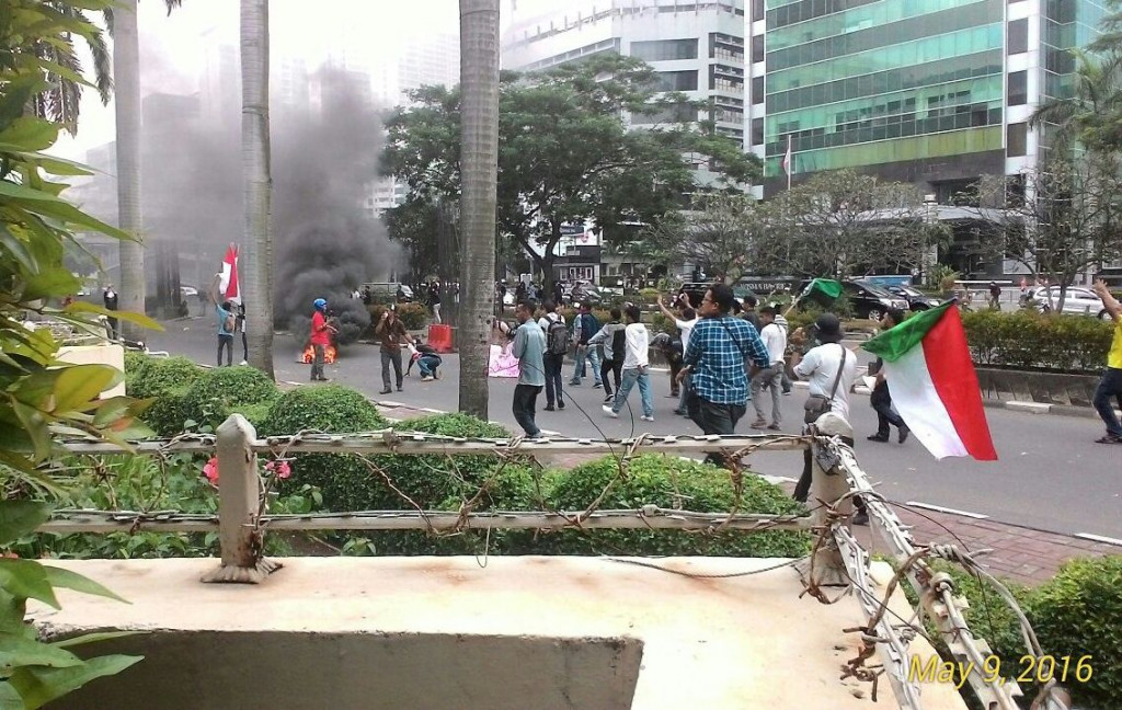 Unjuk rasa, Senin (9/5/2016), ini ricuh. Mulanya mereka membakar ban bekas di depan Gedung KPK. Namun, tak lama kemudian massa melempari Gedung KPK dengan batu.