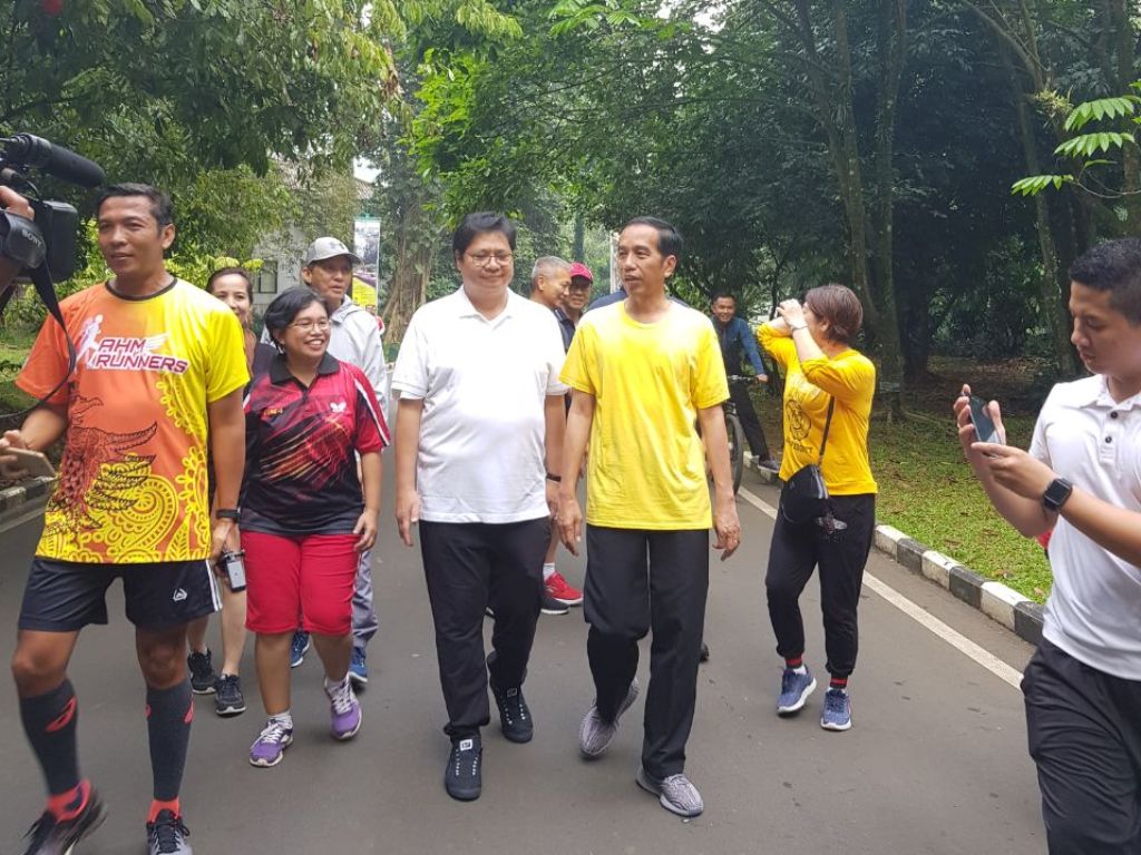 (Airlangga Hartarto (kiri) dan Presiden Joko Widodo berbincang saat olahraga pagi di kawasan Kebun Raya Bogor, Jawa Barat. Foto: Biro Setpres).