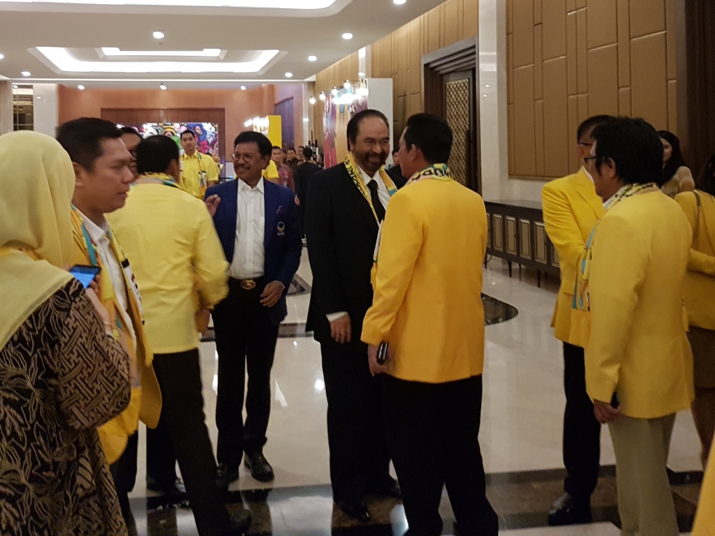 Kehadiran Surya dan Johnny juga didampingi politikus senior Partai Golkar Agus Gumiwang Kartasasmita. Ketiga sempat terlihat akrab saat berbincang-bincang.