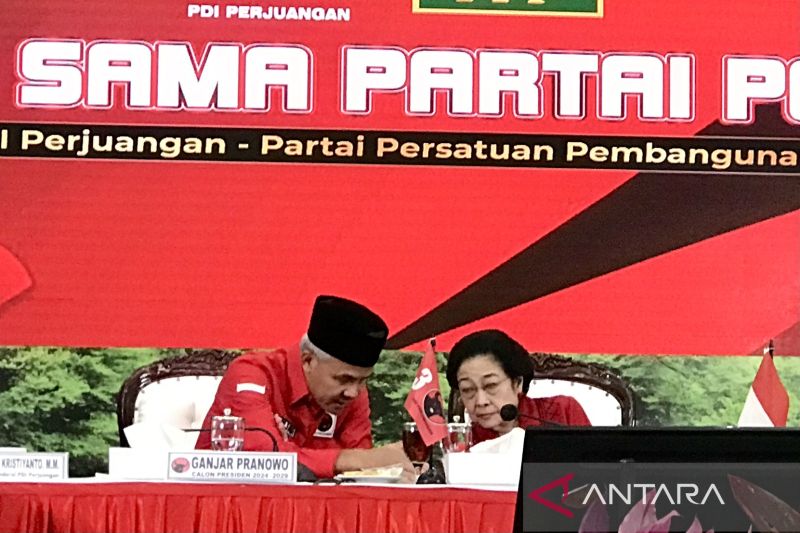 Megawati dan Plt Ketum Partai Persatuan Pembangunan (PPP) Mardiono beserta jajaran pengurus pusat masing-masing partai bertemu selama lebih dari satu jam di Kantor PDI Perjuangan, Jakarta, Minggu, 30 April 2023. Pertemuan antara Megawati dan Mardiono itu merupakan yang pertama setelah dua partai itu secara resmi mengusung Ganjar Pranowo sebagai calon presiden pada Pilpres 2024.