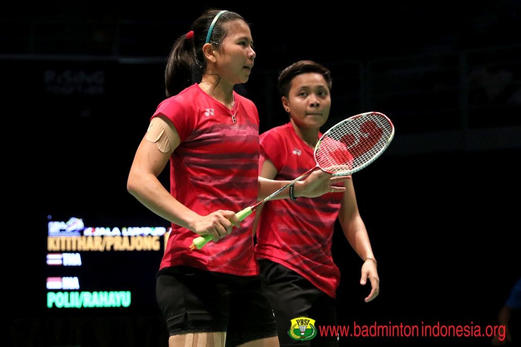 Greysia/Apriani yang diandalkan di sektor ganda putri, juga tak dapat memenangi laga perdana yang berlangsung hari ini di Axiata Arena. Greysia/Apriani dikalahkan Jongkolphan Kittiharakul/Rawinda Prajongjai (Thailand) dengan skor 21-18, 22-20.