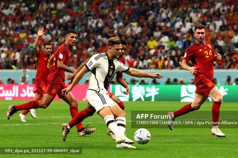 Tak ingin kehilangan kans ke fase gugur, Jerman makin gencar menekan Spanyol. Hasilnya, mereka berhasil menyamakan skor pada menit ke-83 lewat gol Niclas Fuellkrug memanfaatkan umpan Jamal Musiala.