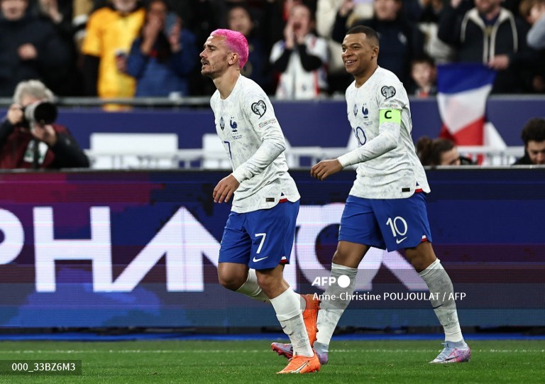 Prancis: 16-M. Maignan, 22- T. Hernandez, 4-D. Upamecano, 13-I. Konate, 5-J. Kounde, 14-A. Rabiot, 8-A. Tchouameni, 7-A. Griezmann, 20-K. Coman, 10-K. Mbappe, 12-R. Kolo Muani. Pelatih: D. Deschamps