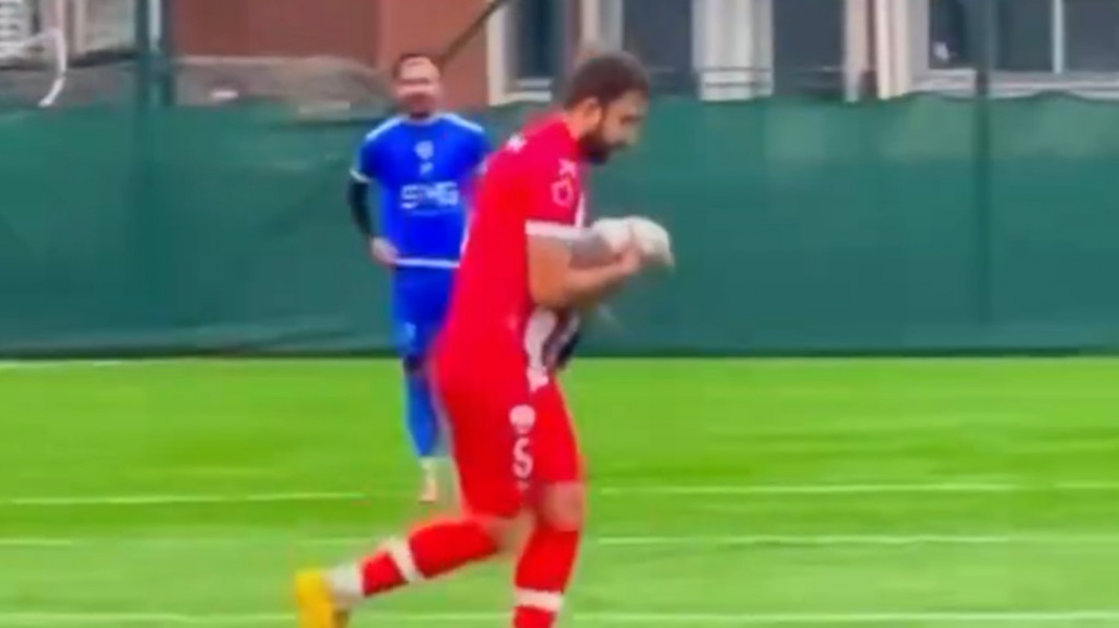 Kiper Istanbul Yurdum Spor, Muhammet Uyanik, berusaha menendang bola. Tapi, bola tersebut justru menghantam burung camar yang sedang terbang di atas lapangan.
