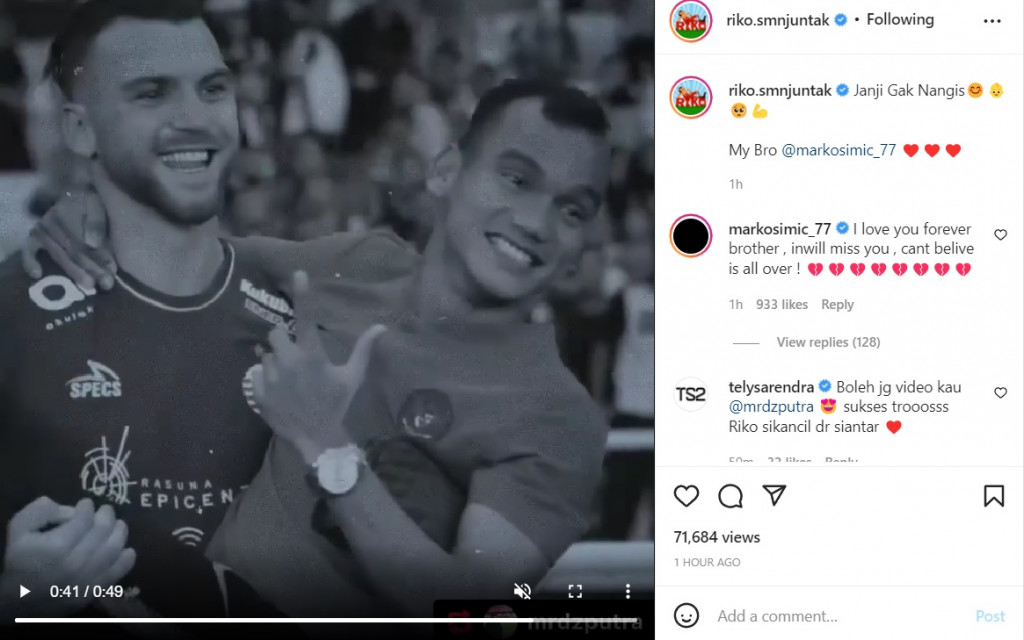 Menariknya, unggahan Riko tersebut langsung direspons Simic dengan menuliskan kalimat yang juga bikin haru. "Saya cinta kamu selamanya saudaraku, dan bakal merindukanmu. Saya tidak percaya semua ini telah berakhir," tulis Simic sambil membubuhi emoticon hati retak berkali-kali.