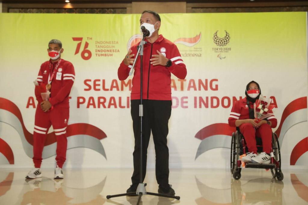 "Atas nama pemerintah, saya menyampaikan selamat datang bagi atlet dan pelatih. Salam hangat dari Bapak Presiden Joko Widodo. Beliau menyampaikan terima kasih dan rasa bangga dari presiden atas nama seluruh rakyat Indonesia kepada para atlet dan pelatih yang sudah berjuang di Paralympic, Tokyo," tambahnya.