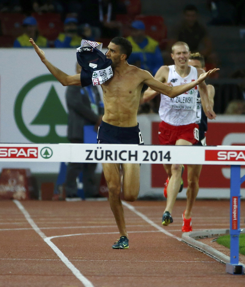 Benabbad yang bertanding di nomor 3 ribu meter halang rintang itu unggul jauh dari para lawannya jelang garis finish. Tidak ingin menyelesaikan lomba dengan cara biasa, pelari 29 tahun tersebut kemudian membuka bajunya beberapa meter dari garis akhir layakanya seorang pemain sepak bola yang merayakan gol.