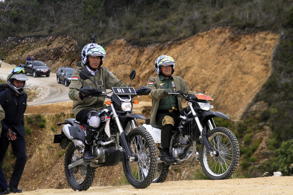 Seperti saat Jokowi melihat pembangunan jalan trans Papua, Presiden menggunakan Kawasaki KLX150 BF. Selain Jokowi ada Panglima TNI dan sejumlah Menteri yang ikut