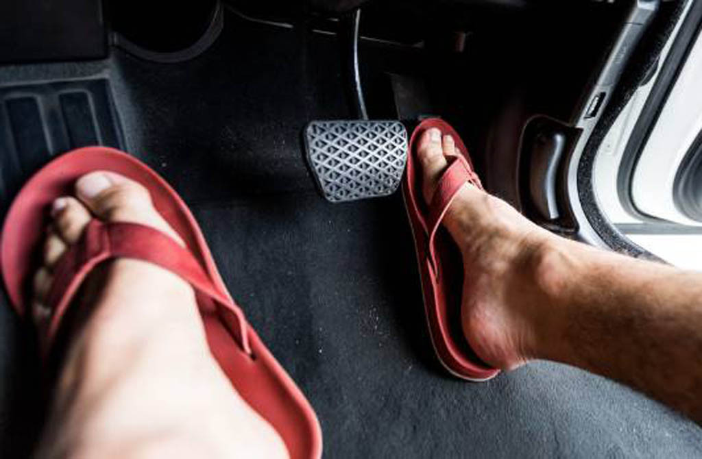 Untuk alas kaki, banyak orang yang lebih suka mengemudi pakai sandal jepit. Hal ini justru bisa menimbulkan bahaya, karena sensitifitas kaki terhadap pedal jadi jauh berkurang.