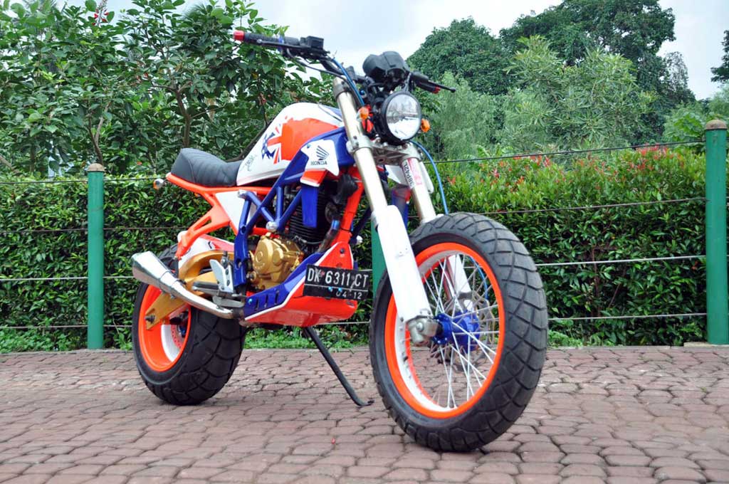 super dirtbike, dengan ban kasar berukuran besar. Motor juga dibuat lebih jangkung supaya pas sama konsepnya," buka modifikator