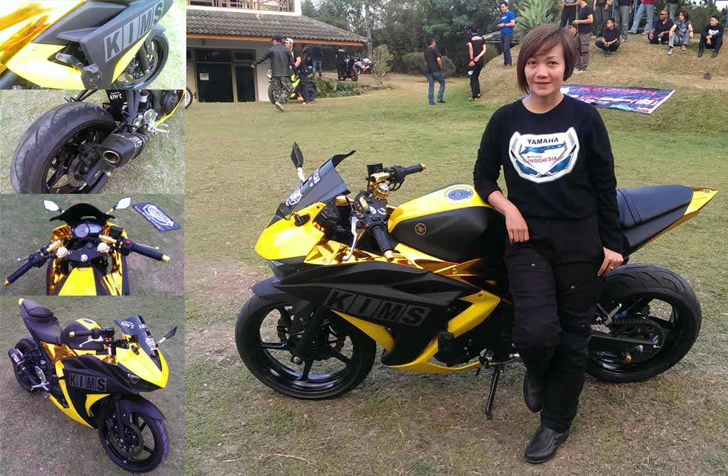 R25 yang dipunya Merry sapaan akrabnya, adalah hasil modifikasi suaminya, Irwan Widajaja. Sang suami memang doyan mendandani sepeda motor lantaran memiliki bengkel bernama KIMS Racing. Di motor milik Merry, Irwan mengaplikasi konsep elegan dengan paduan warna yang sangat pas.
