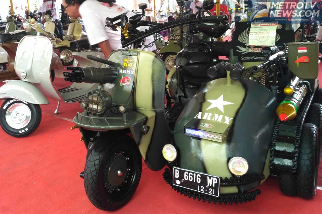 medcom.id, Yogyakarta: Sebuah motor Vespa menyerupai mobil tank mini terparkir di halaman depan Jogja Expo Center, Bantul DIY. Motor vespa Super keluaran 81 ini sudah dimodifikasi sedemikian rupa seperti alutsista perang TNI AD.