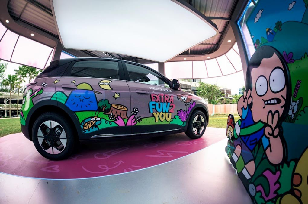 Geely EX2 sebagai kanvas idenya. Hasil karyanya pun ditampilkan melalui instalasi interaktif Ben’s Backyard x Geely di