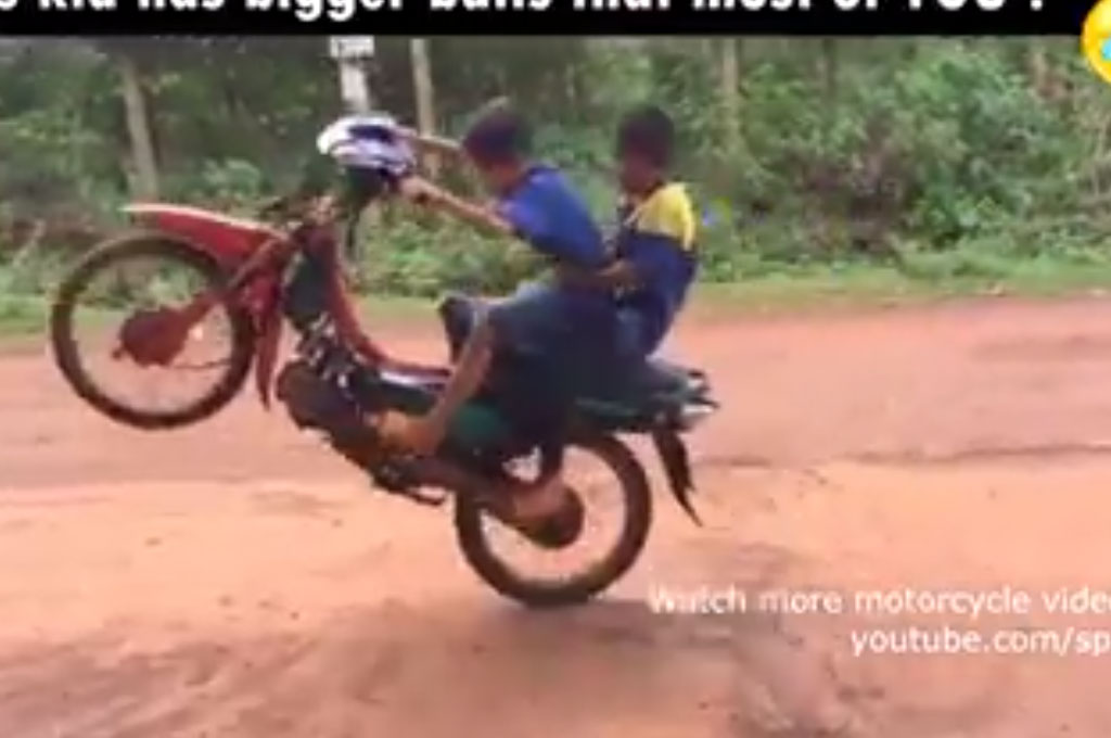 Seperti contoh sebuah video berdurasi 45 detik yang sempat beredar di facebook. Video ini memperlihatkan seorang bocah beraksi dengan sepeda motornya sembari mengangkat ban depan (wheelie) saat sedang berjalan.