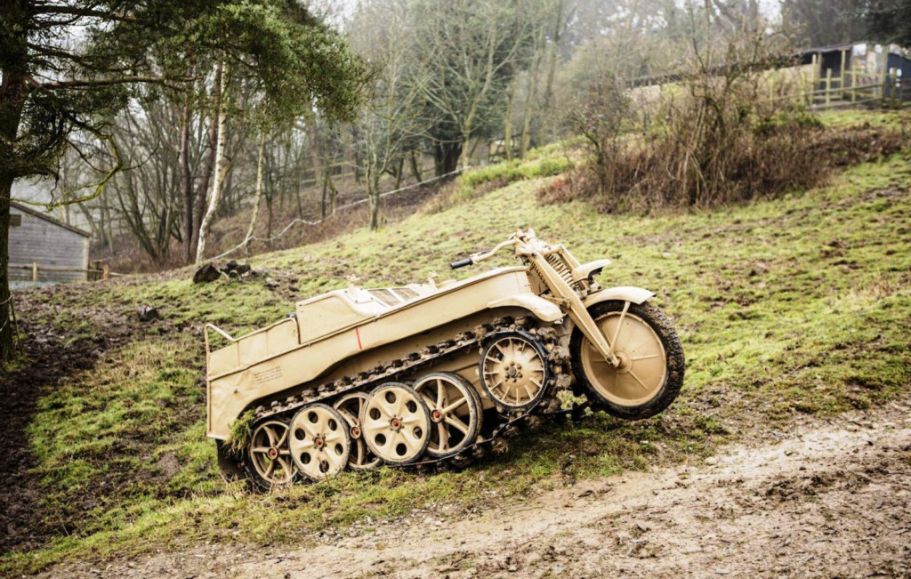 Seperti senjata tempur inovatif lain pada PD II, sepeda motor beroda rantai berkapasitas tiga tentara itu dibuat oleh Jerman. Patroli pasukan gerak cepat Nazi menggunakannya sebagai kendaraan serbu di medan Eropa Timur yang berlumpur tebal dan mengintai musuh di gurun-gurun pasir Afrika Utara.
