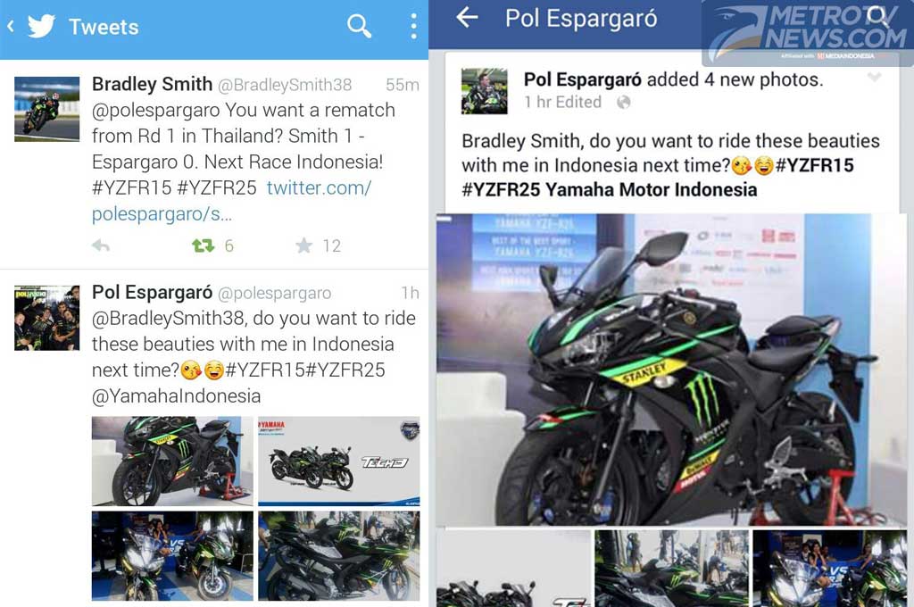 Di social media itu, Pol bilang “Mau naik motor ini dengan saya di Indonesia next time?” Dan Bradley (@BradleySmith38) menimpali, ”Kamu mau bertarung ulang seperti di Thailand? Smith 1 – Espargaro 0. Next race Indonesia!”