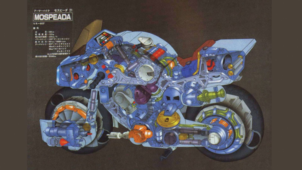 Kemudian ketika menjadi sepeda motor, Mospeada menjadi superbike.Jantung pacu motor ini adalah turbin multi-bahan bakar kecil dengan tenaga 300 daya kuda. Tenaga tersebut disalurkan ke transmisi dual-clutch 8-percepatan..