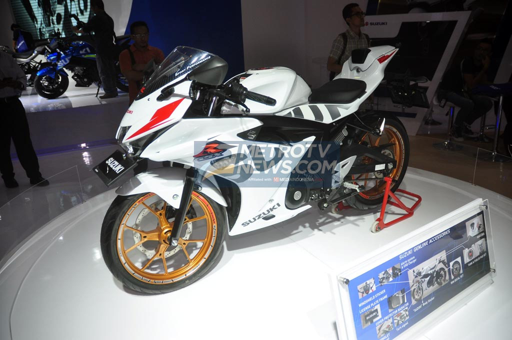 medcom.id, Jakarta: Suzuki belum lama ini debut dunia dua motor sport terbaru, yakni GSX-R150 dan GSX-S150. Kini, Suzuki menampilkan versi aksesori untuk model GSX-R150 di Indonesia Motorcycle Show (IMOS) 2016, di JCC Senayan, Jakarta, Kamis 3 November.
