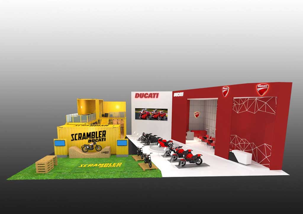 Booth Ducati bakal memiliki luas 430,5 meter persegi, dengan konsep booth yang mencerminkan brand equity Ducati, style, performance & technology serta booth khusus Scrambler dengan warna dasar kuning yang diterapkan di seluruh dunia.