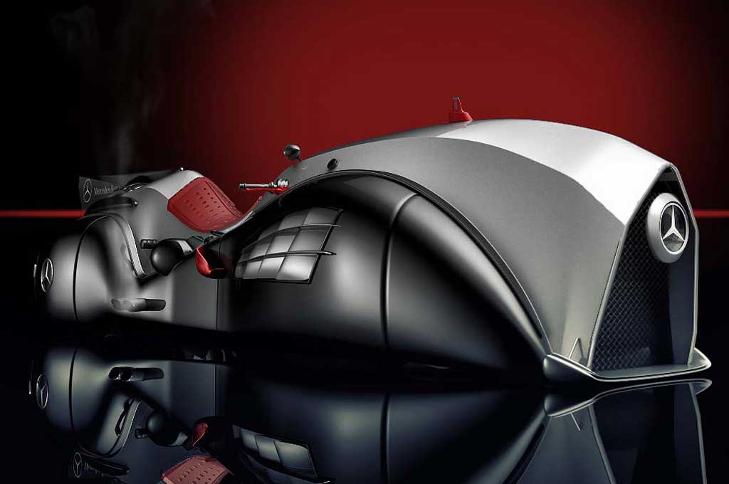 Motor imajinasinya memiliki grill depan yang besar dan lengkap dengan logo bintang khas pabrikan asal Jerman tersebut. Dengan kombinasi kelir perak dan abu-abu, desain ini mengingatkan pada desain klasik pabrikan yang berpusat di Stuttgart Jerman.