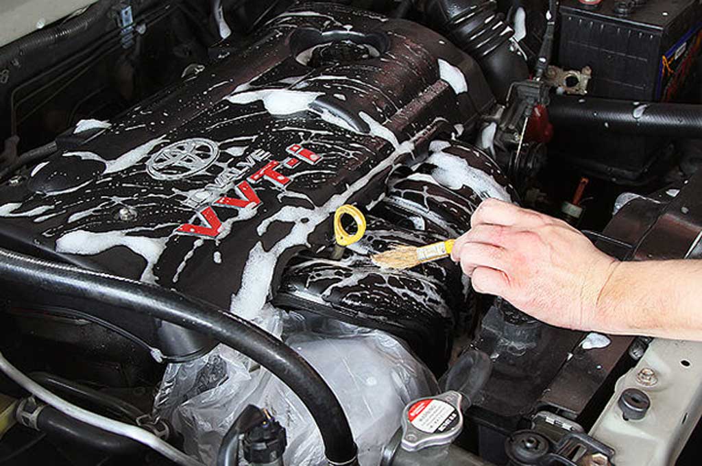 Untuk membersihkan kotoran mobil yang menempel bisa menggunakan spon atau kuas. Jika ada kerak oli bisa melarutkannya dengan cairan khusus yang kini telah banyak di jual di pasaran.