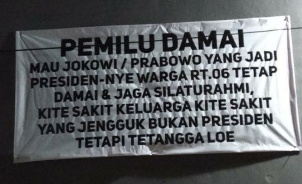 'Mau Jokowi/Prabowo yang jadi presiden-nye warga RT 06 tetap damai dan jaga silaturahmi. Kite sakit, keluarga kite sakit, yang jenguk bukan presiden tetapi tetangga loe'