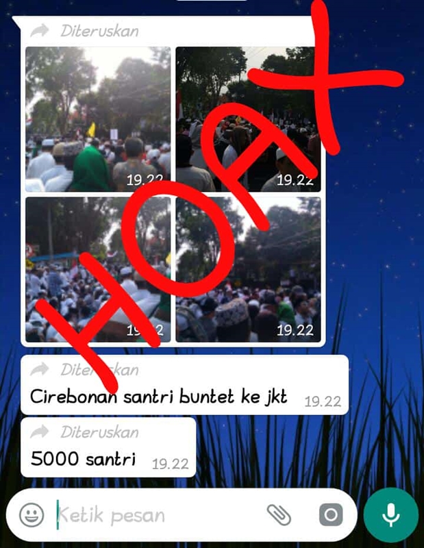 Dalam informasi yang disebarkan, disebutkan 5.000 santri Buntet ke Jakarta. Informasi ditambahi foto kerumunan massa berpeci.