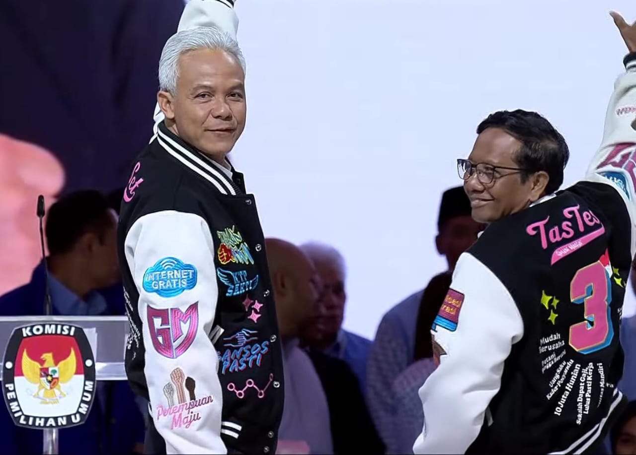 Ganjar Pranowo-Mahfud MD memakai jaket kombinasi warna hitam dan putih. Pada jaketnya, terdapat sejumlah emblem serta bordiran yang berisi visi misi mereka.